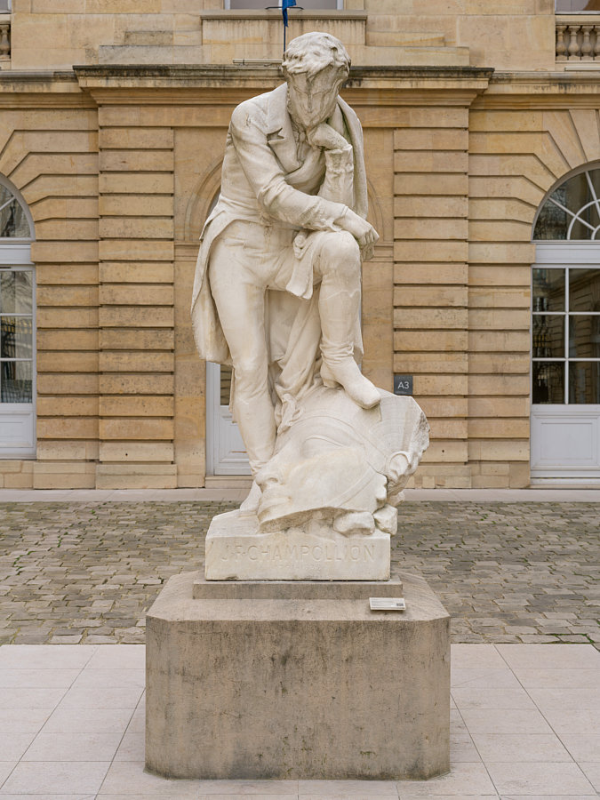 Bibliographie : Julien Auber de Lapierre, « Une statue pour Champollion ou l’Œdipe qui vainquit le sphinx », dans J.-L. Fournet (dir.), Champollion 1822, et l’Égypte ancienne retrouva la parole, éditions du Collège de France, Paris, 2022, p. 108-126.